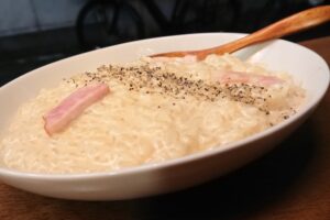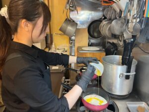 米原さんは「売れやすいものには塩、糖、脂がそろっている」と分析し、おじやに“脂”を追加したメニューを考案した。卵と牛乳、みその「カルボナーラ風おじや」や、ニンニクとオリーブ油の「トマトおじや」などだ。