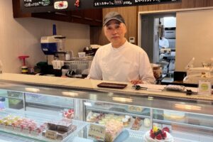 店主の山室典政さんは高校生の頃からパティシエを目指し、26歳でフランスに渡るなど腕を磨いてきた。2008年に40歳で念願の自分の名前を冠した店を開き、16年にはリニューアルしてカフェスペースを併設した。